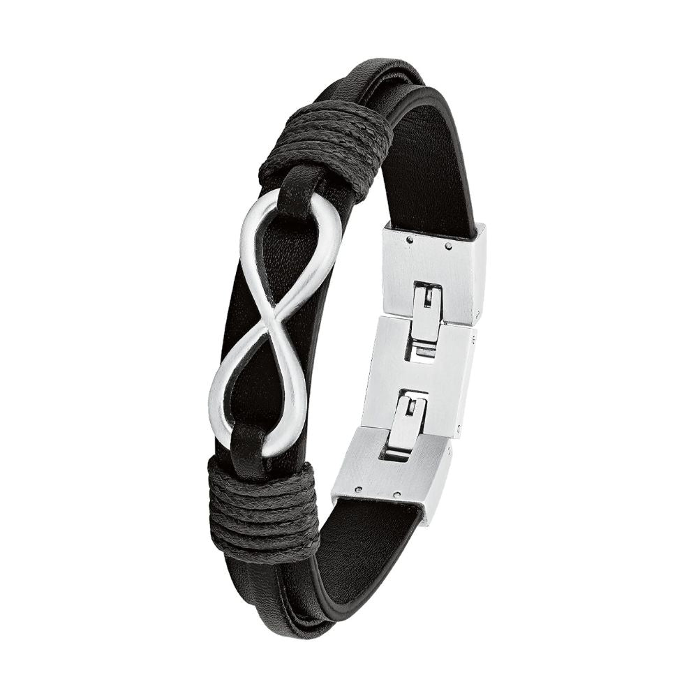 Design: Mehrreihiges Armband aus schwarzem Rindsleder mit Infinity-Symbol aus robustem Edelstahl