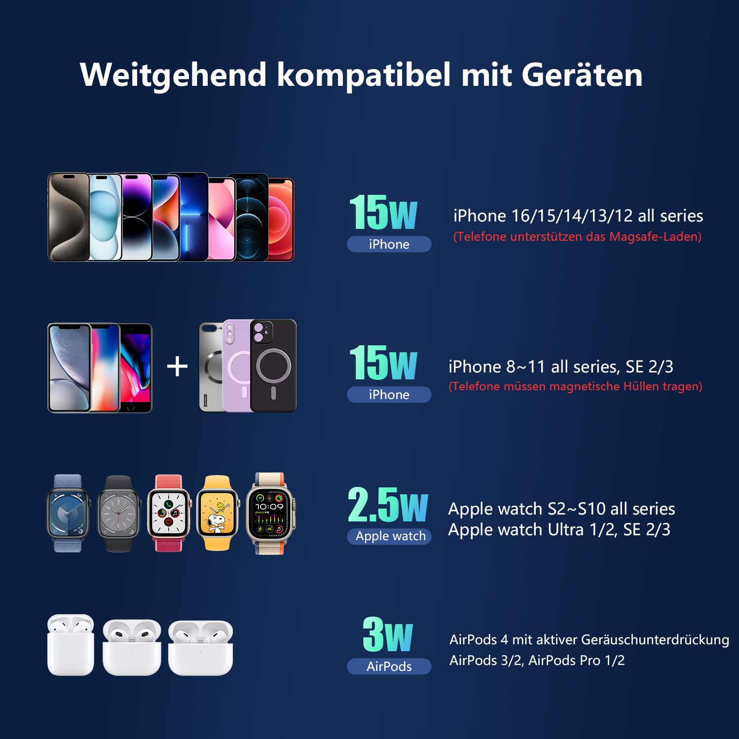 Compatible with iPhone 8-16 series, Apple Watch Series 2–Ultra 2 and all major AirPods models.