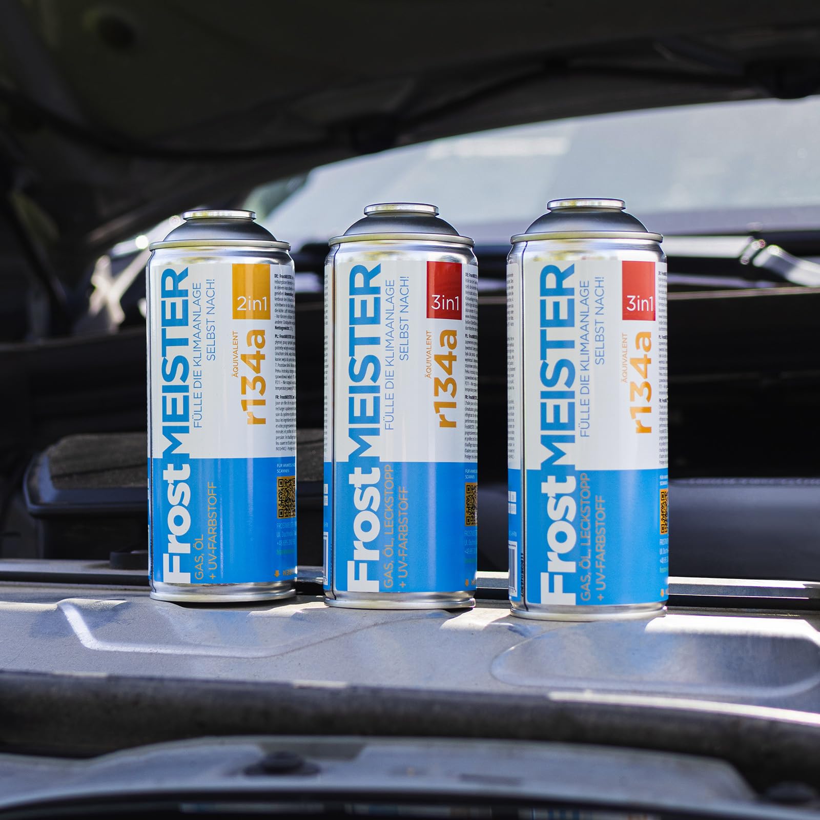 FrostMEISTER 3-in-1 car air conditioning refill kit for R134a (2x 400ml cans & hose with pressure gauge)