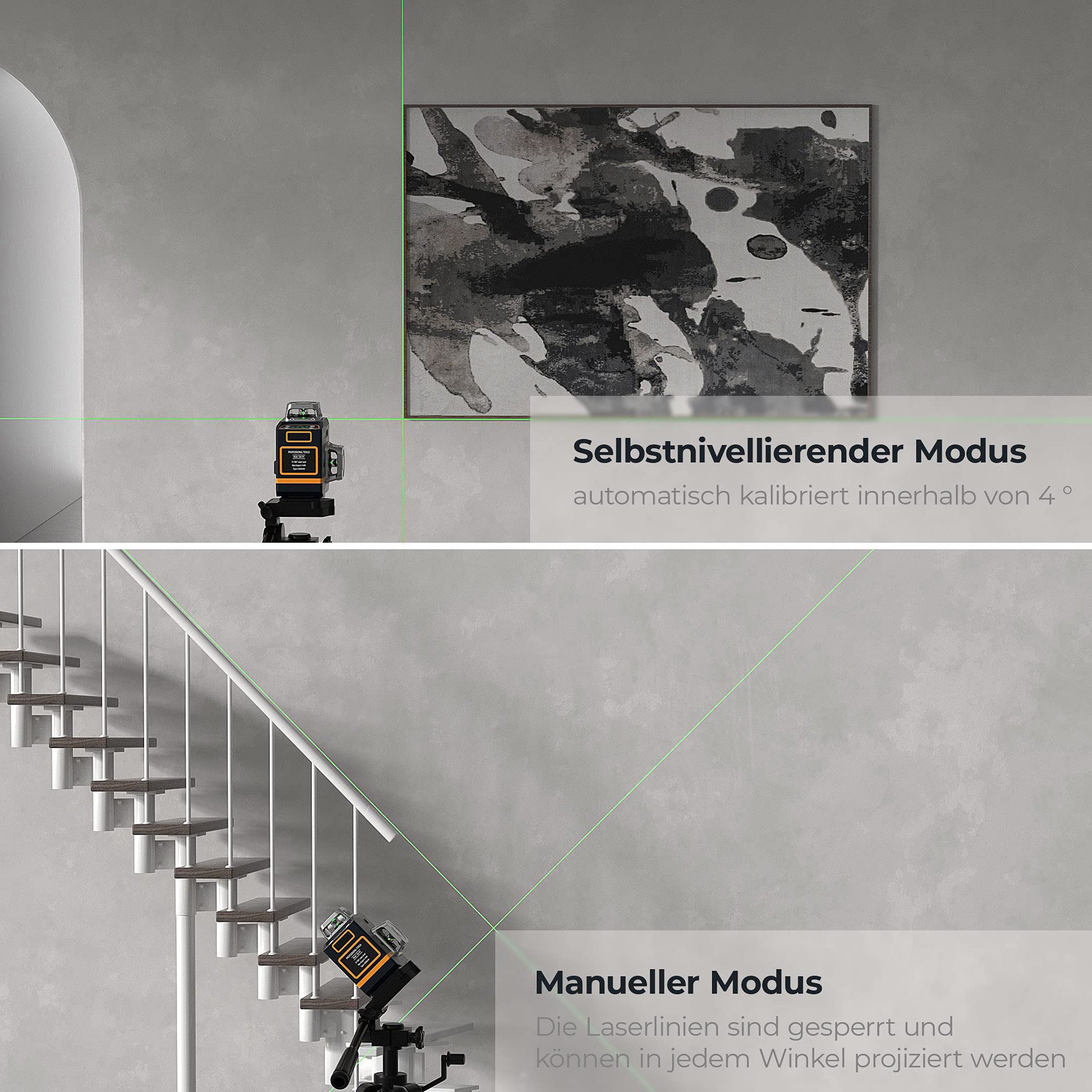 - 3x 360° laser lines: Horizontal and two vertical lines for comprehensive alignment on walls, floors and ceilings