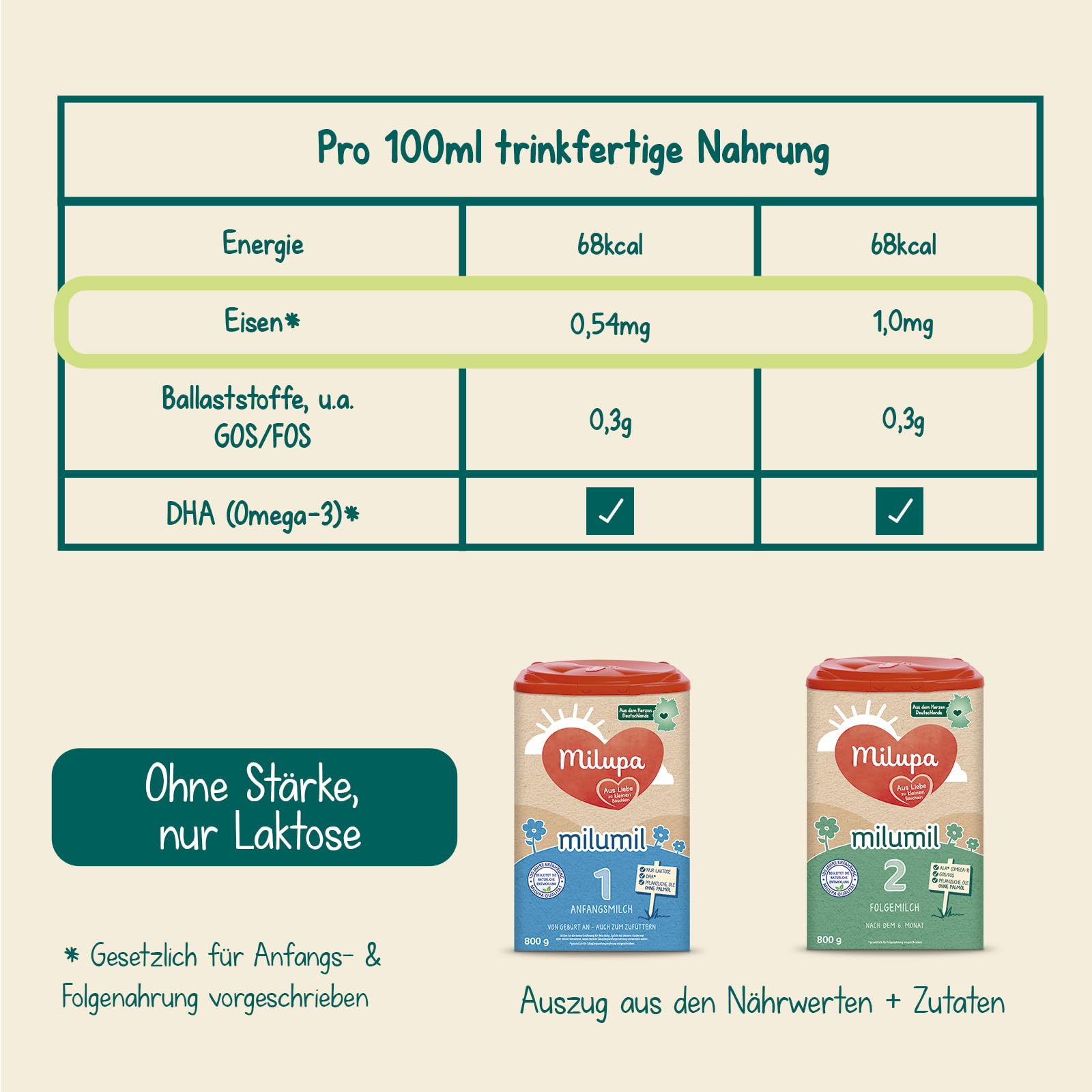 Quality promise: Without palm oil , with a proven mix of lactose and important vitamins.