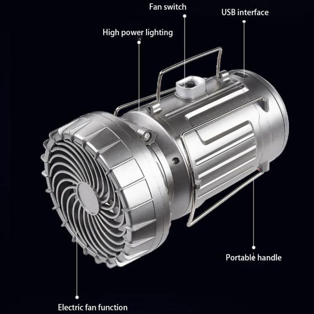 This portable solar camping light with an integrated fan is perfect for all your outdoor activities. Whether camping, hiking, or emergencies - stay illuminated and connected at all times.