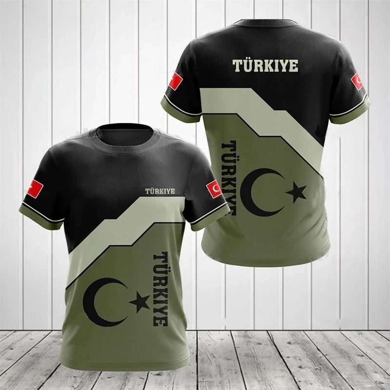 The first design showcases shades of green and black with the iconic crescent moon and star on the front and back. Rectangular Turkish flags in red and white adorn the sleeves, complemented by the striking inscription "TÜRKIYE".