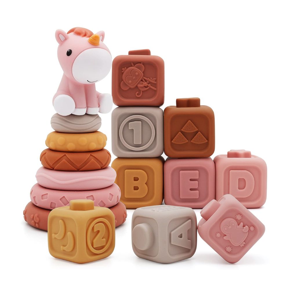 Das Gilowin Stapelspielzeug in Rosa vereint Spielspaß, Lernen und Zahnungshilfe in einem liebevoll gestalteten Set. Es enthält 6 unterschiedlich große Stapelkreise, 6 strukturierte Blöcke und ein niedliches Pferd als Abschlussfigur. Die pastellfarbenen Elemente fördern die Farbwahrnehmung, während geprägte Zahlen, Tiere und Formen die sensorische Entwicklung und Feinmotorik unterstützen.