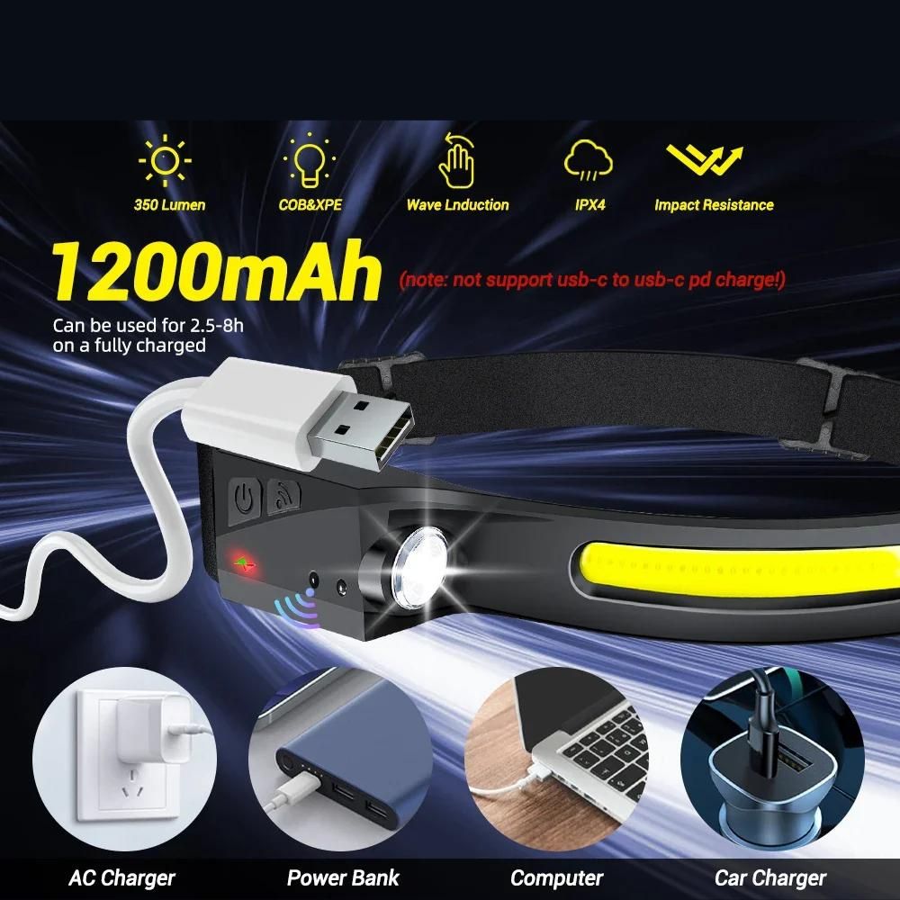 Lampe frontale à capteur LED, rechargeable par USB, pour les activités de plein air
