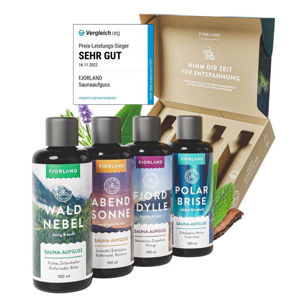 Fjorland BIO Ätherische-Saunadüfte Geschenkset (4x100ml) in hochwertiger Geschenkbox