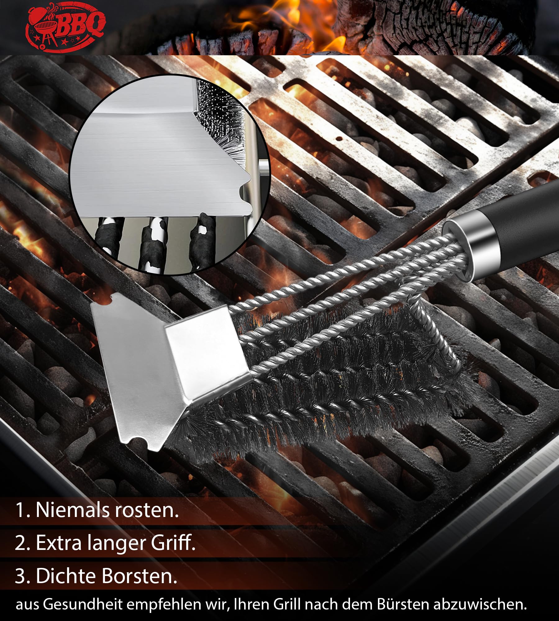 - 【3IN1-BÜRSTE MIT SCHABER】 - Immer noch in den Trümmern stecken, die an Ihrem Lieblingsgrill kleben? Egal wie viel Waschmittel Sie verwenden, Sie können Ihren Grill nicht gut mit Ihrer Grillbürste reinigen? Sie verwenden nur das falsche Werkzeug! Diese Grillbürste mit extra scharfem Schaber aus Edelstahl kann hartnäckigen Schmutz mit ein wenig Aufwand leicht schrubben. Sparen Sie Zeit und Mühe, lass uns einfach Spaß haben.